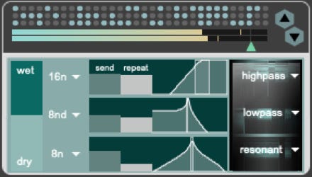 Each delay can be configured with settings such as delay time (16n, 8nd, 8n, 4n), send level, repeat, and filter.
